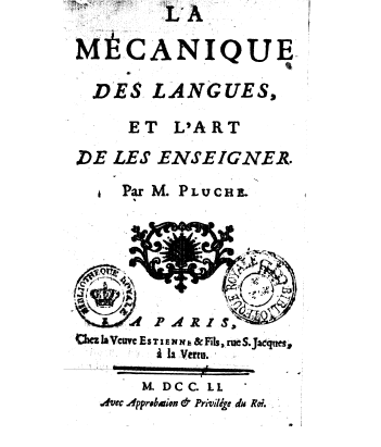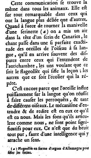 Antoine Pluche (1688-1761) : La mécanique des langues, et l’art de les enseigner, Ed. Vve Estienne et fils, Paris, 1751 – la serinette p.70