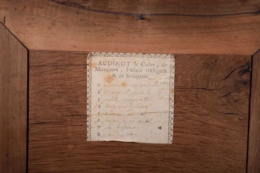 | – Restauration d’une serinette GAVOT fils par Xavier Szymczak – Serinette, Gavot fils,1763, VMi 406, Musée municipal Auguste Grasset (Varzy) |